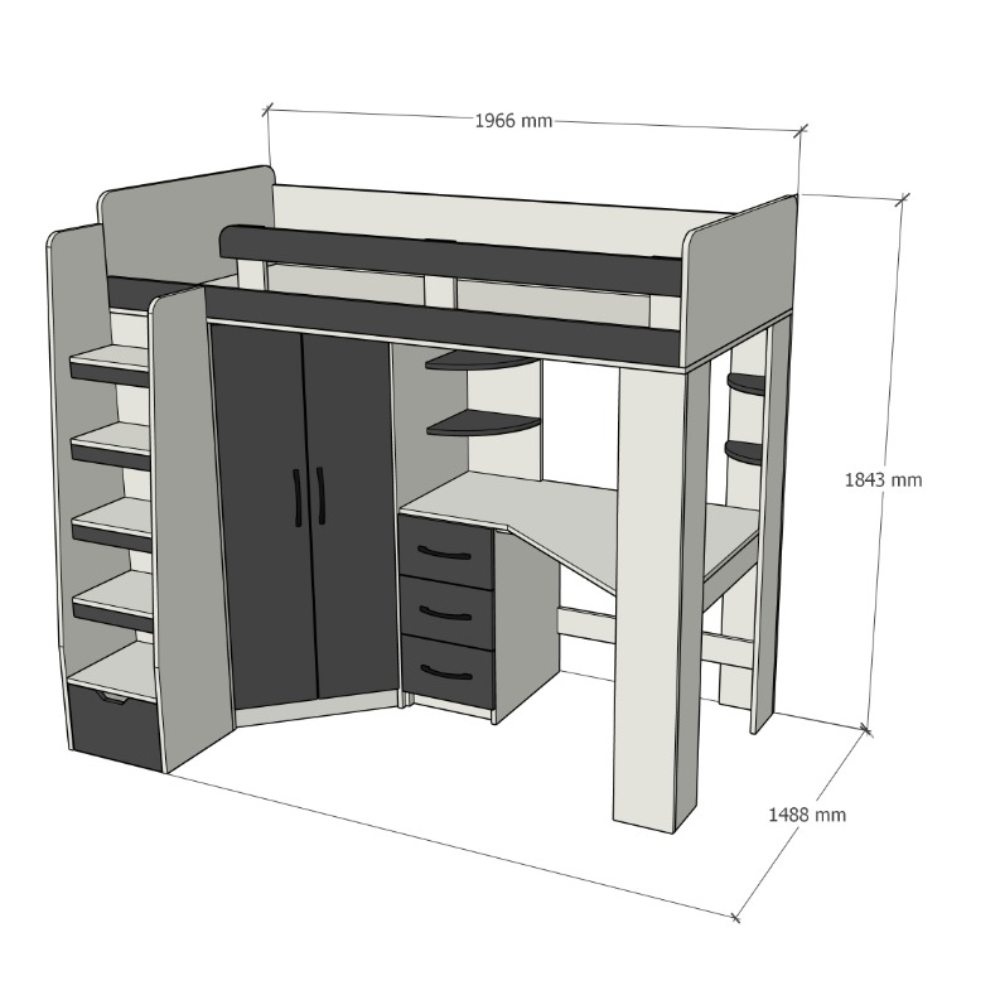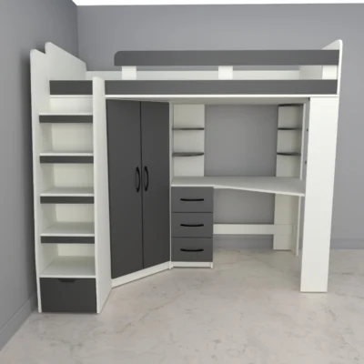 Hermoso diseño de camarote infantil disponible en 1 plaza y plaza y media, color grafito con blanco, multifuncional con closet, escritorio y escalera cajonera, para poder aprovechar todo el espacio posible, si deseas en otro color contactanos para cotizarte, convierte tu espacio e ese lugar acogedor que esperas.