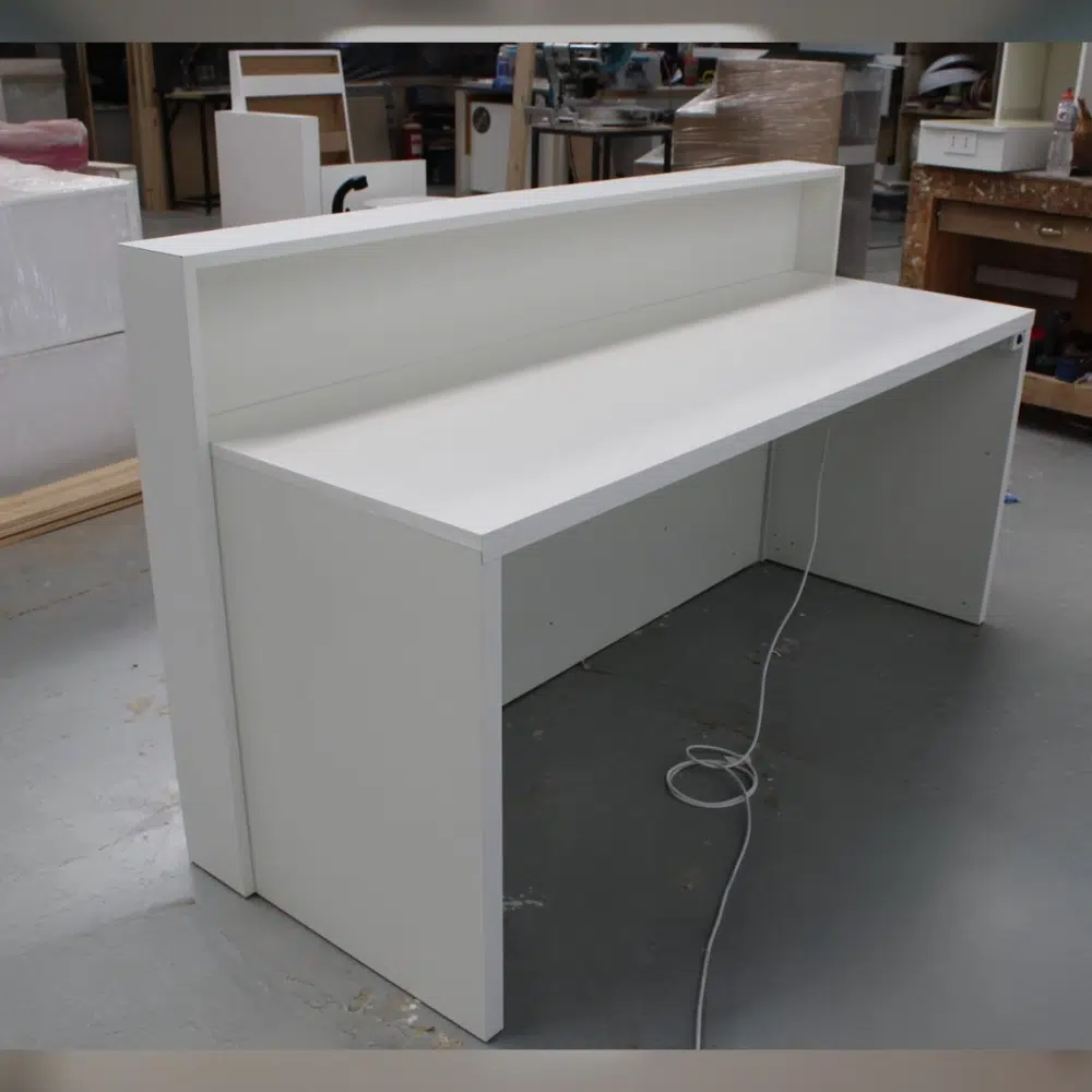Hermosa recepcion comercial con led, hecha en melamina 18mm enchapada en formalita brillante, un diseño muy elegante para tu negocio, además de ser funcional y sencilla, si deseas personalizar medidas,colores o agregar tu LOGO CON ILUMINACION LED, se realiza con un costo adicional, contáctanos.